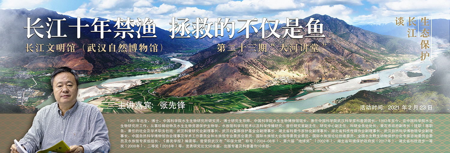 2021年2月23日,长江文明馆(武汉自然博物馆)特邀请中国科学院水生生物博物馆馆长、中国科学院武汉科学家科普团团长张先锋教授来到大河讲堂,通过网络视频直播形式,围绕“丰富多彩的长江水下世界”、“长江‘病了’”、“长江生物多样性保护对策”等三个方面内容,以“长江十年禁渔,拯救的不仅是鱼”为主题,从生态学的角度谈长江生态保护,引领大家认识长江大保护战略,贯彻宣传习近平总书记“共抓大保护、不搞大开发”的重要指示精神,强调长江大保护的核心之一是长江生物多样性保护,影响更多广大民众积极参与进来,共同保护长江生物多样性和长江生态环境。