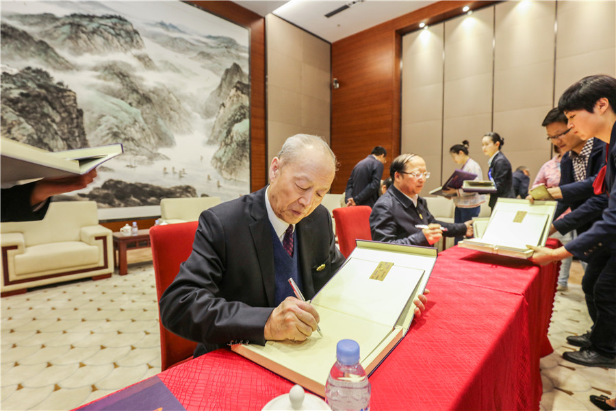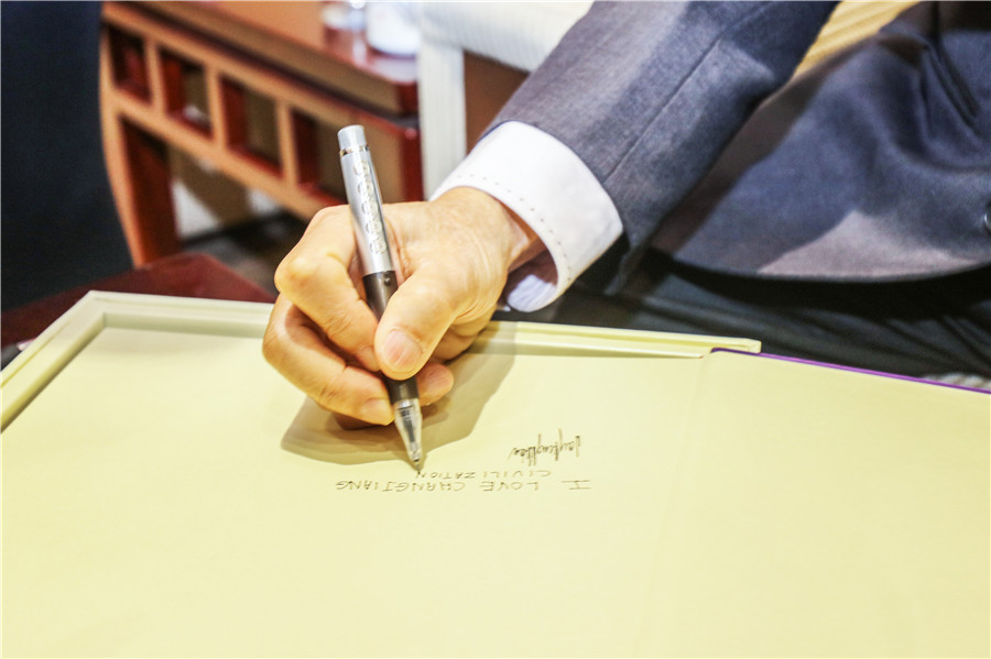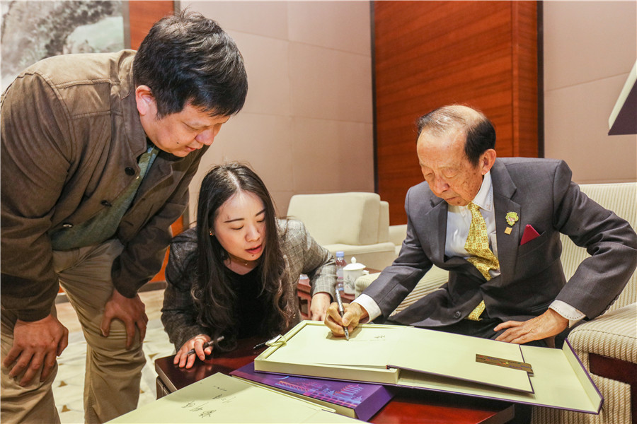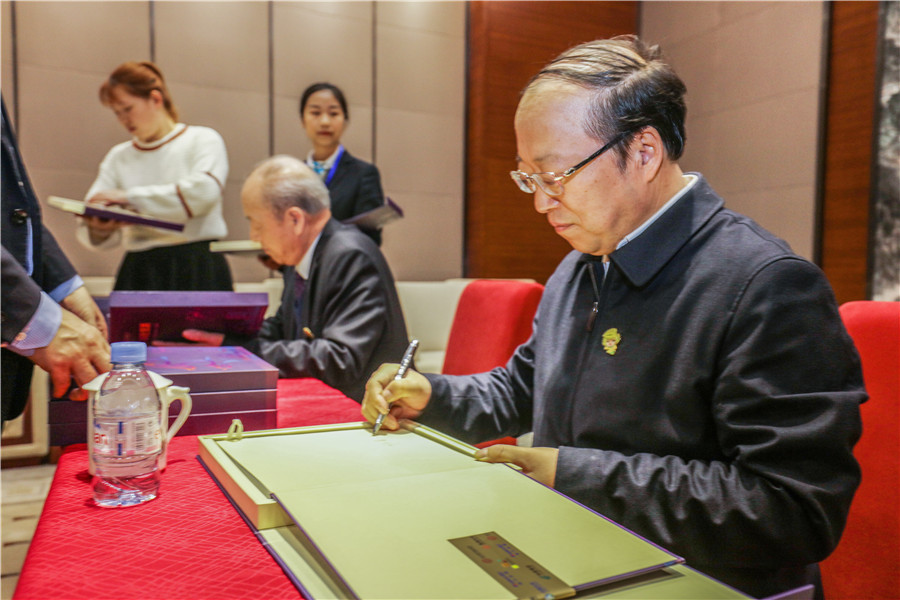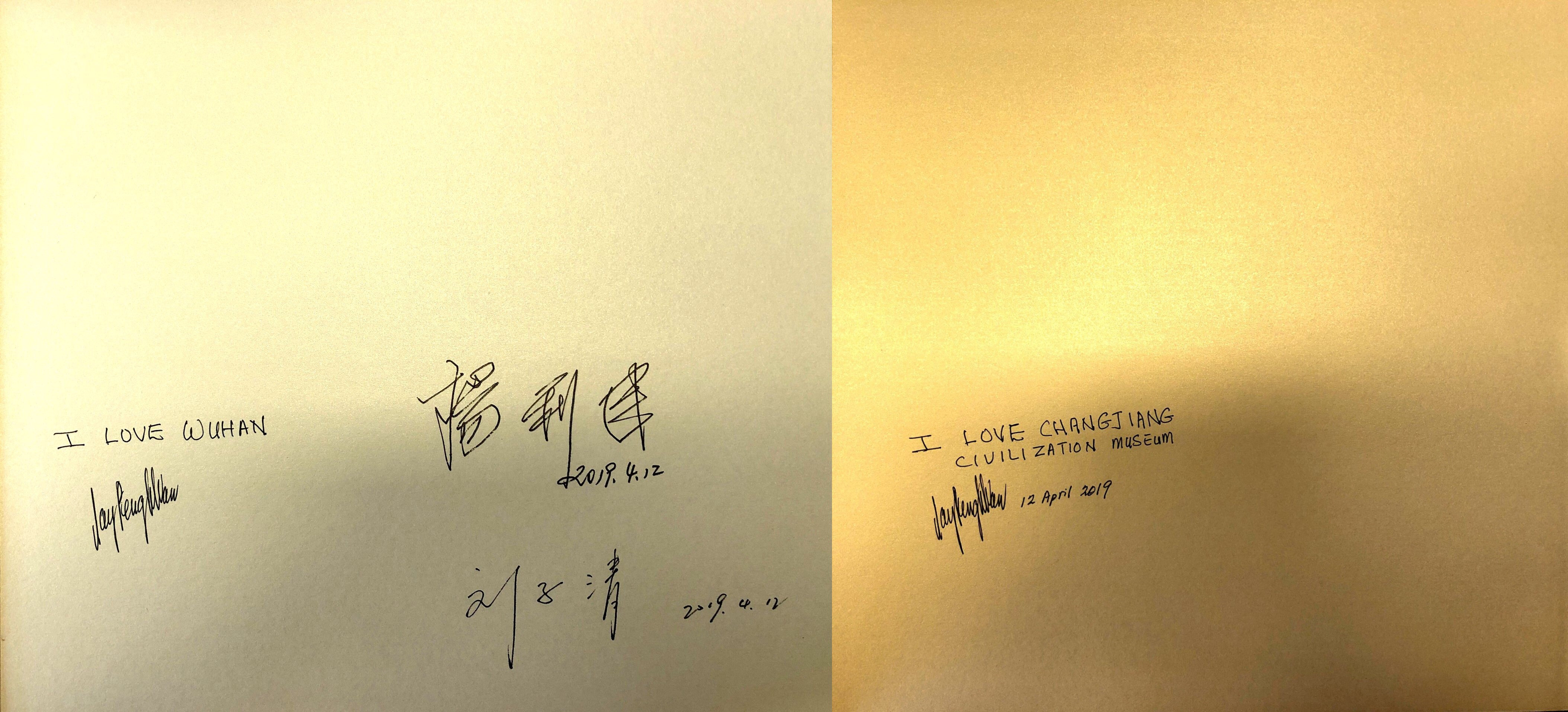 在参观结束后,郑炳贤先生、杨利民会长以及刘子清副市长在“生态园博 绿色生活——第十届中国(武汉)国际园林博览会”的纪念集邮册上签名,郑炳贤先生还留字“I LOVE WUHAN”、“I LOVE CHANGJIANG CIVILIZATION MUSEUM”(我爱长江文明馆)足见对武汉以及长江文明馆(武汉自然博物馆)的喜爱之情。