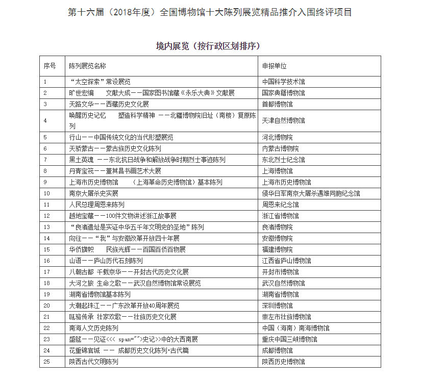 第十六届(2018年度)全国博物馆十大陈列展览精品推介申报项目在全国范围内共有80项展览参与申报,根据投票结果,得票排名前25位的境内展览和前4位的出入境展览入围终评。