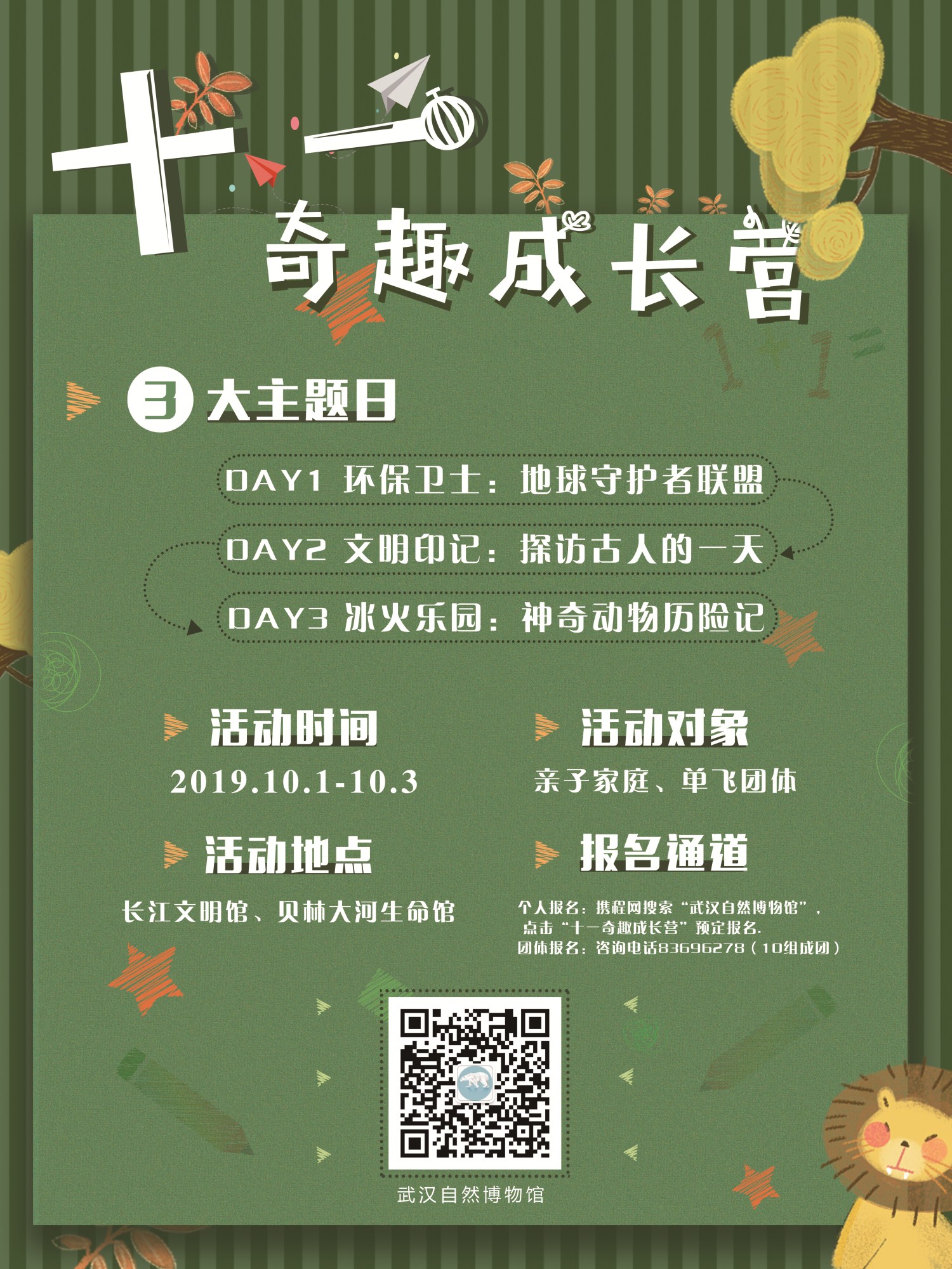 十一不知去哪儿玩?10月1日-10月3日,来武汉自然博物馆参加2019十一奇趣成长营,三大奇妙主题,独创手工DIY环节 #快带孩子来一场最有趣的自然探索活动吧!