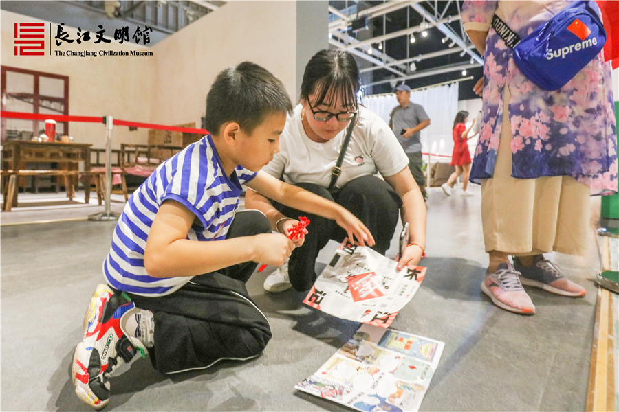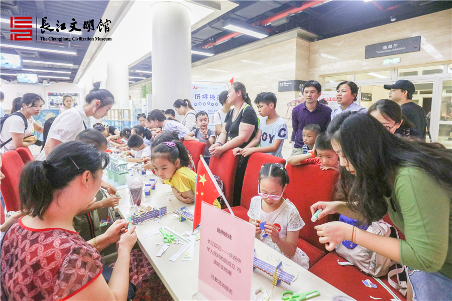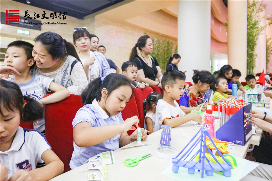 此外,长江文明馆还根据展览内容特别准备了两项社教活动,一是“纸桥挑战”,观众可在专设的社教互动区扫码免费参与,学习桥梁力学原理、动手制作长江大桥模型;二是在展览内“寻找长江印记”,获取特别礼品。