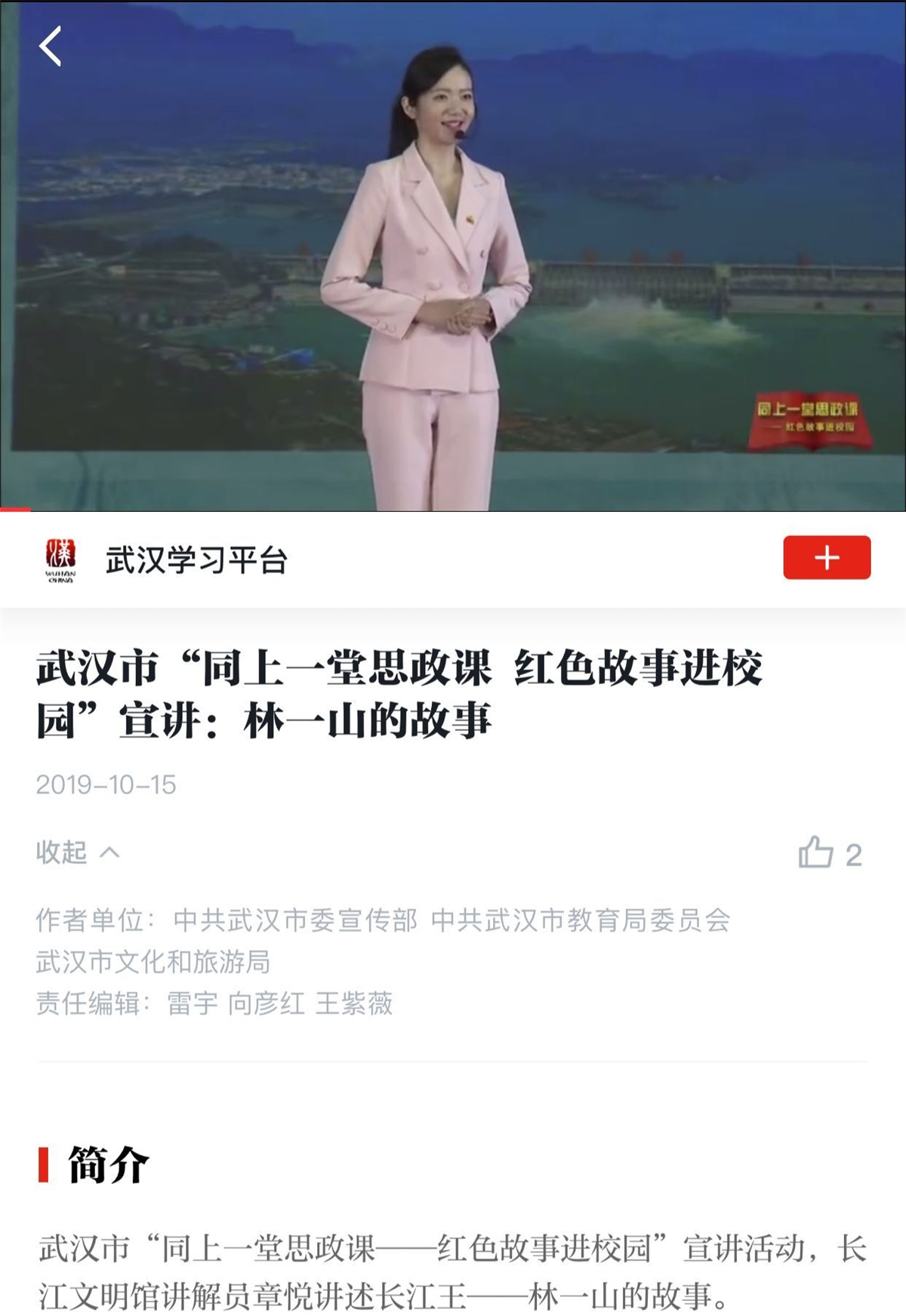 这段话来自长江文明馆(武汉自然博物馆)金牌讲解员章悦在武汉市“同上一堂思政课——红色故事进校园”宣讲活动中的讲述。章悦以《赤子匠心长江王》为题,以专业的知识储备和感人肺腑的表达,声情并茂地讲述了长江王——林一山的故事,让在场的学生无不为之动容。10月15日,章悦的深情讲述登上了“学习强国”平台。