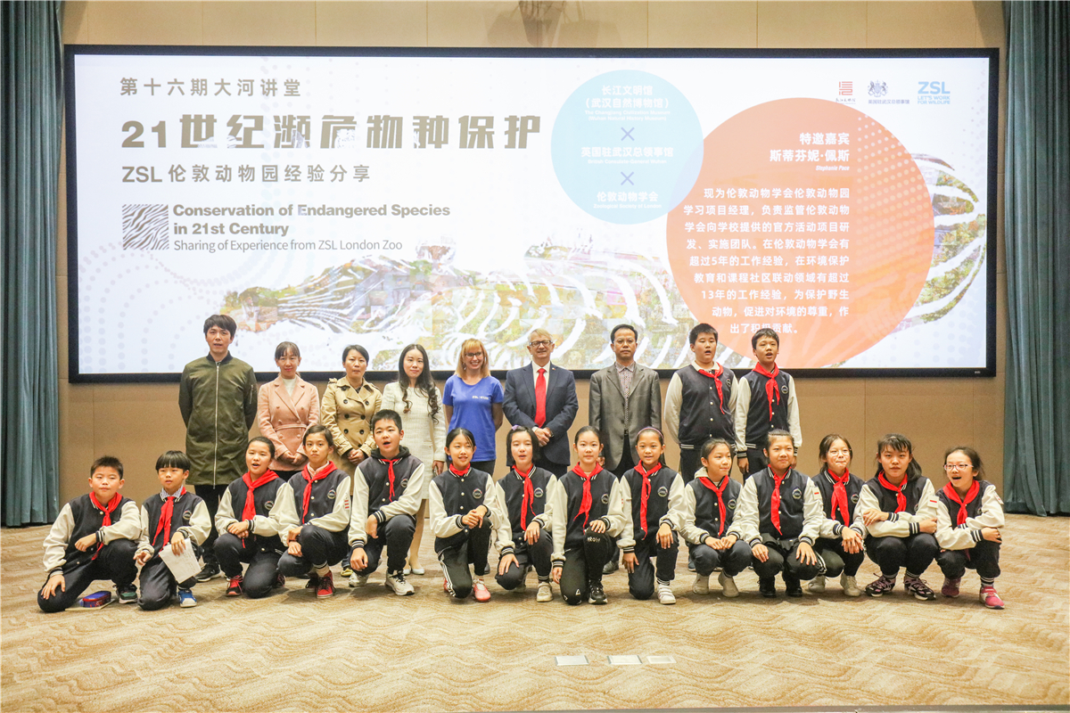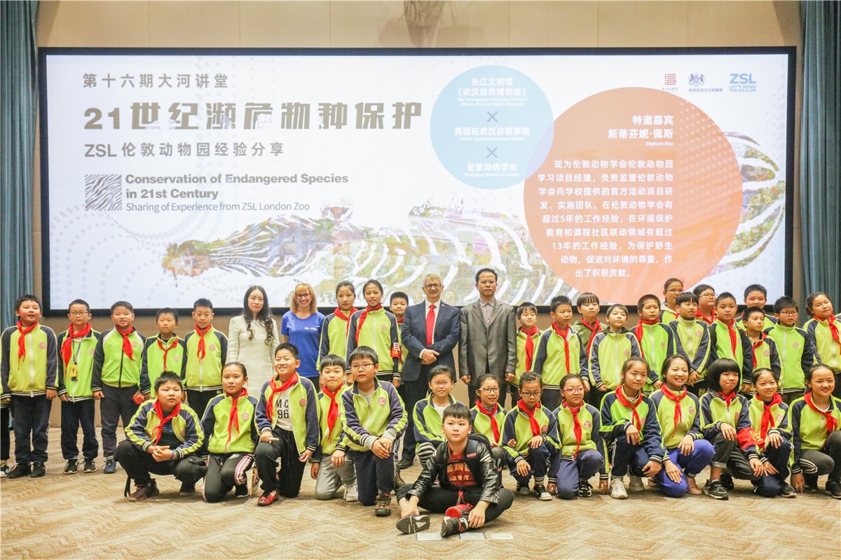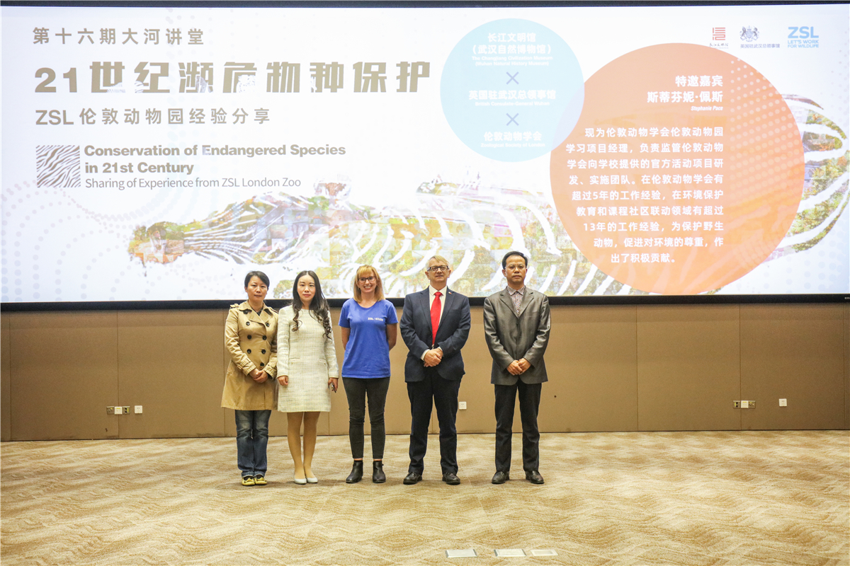 11月7日,伦敦动物学会(The Zoological Society of London,简称ZSL)动物保护领域教育专家斯蒂芬妮·佩斯女士的“21世纪濒危物种保护——ZSL伦敦动物园经验分享”在长江文明馆“大河讲堂”开讲。这是英国驻武汉总领事馆、伦敦动物学会、长江文明馆(武汉自然博物馆)合作开展的“聆听自然”自然教育系列主题活动的重要部分,也是长江文明馆“大河讲堂”首次邀请国外专家开讲。