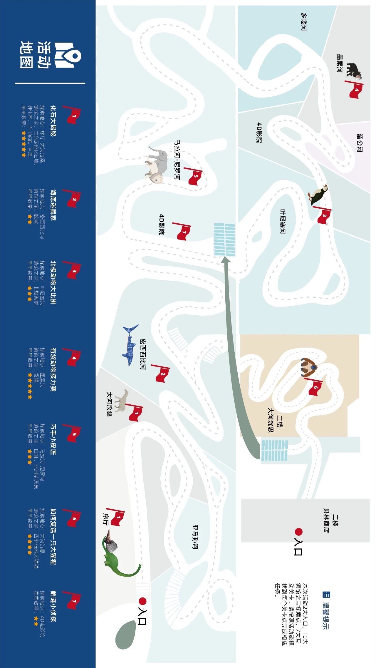 活动入口有2处,分别为贝林大河生命馆前台(临近关卡1)与贝林商店(临近关卡3、关卡6、关卡7),每队可自主选择活动入口与起始关卡。