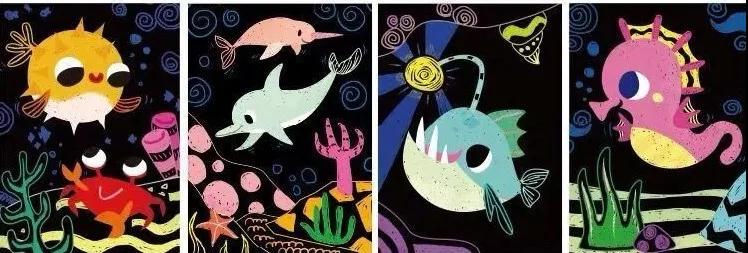 ?要求:在所有生物刮画中找出5张海洋动物刮画。