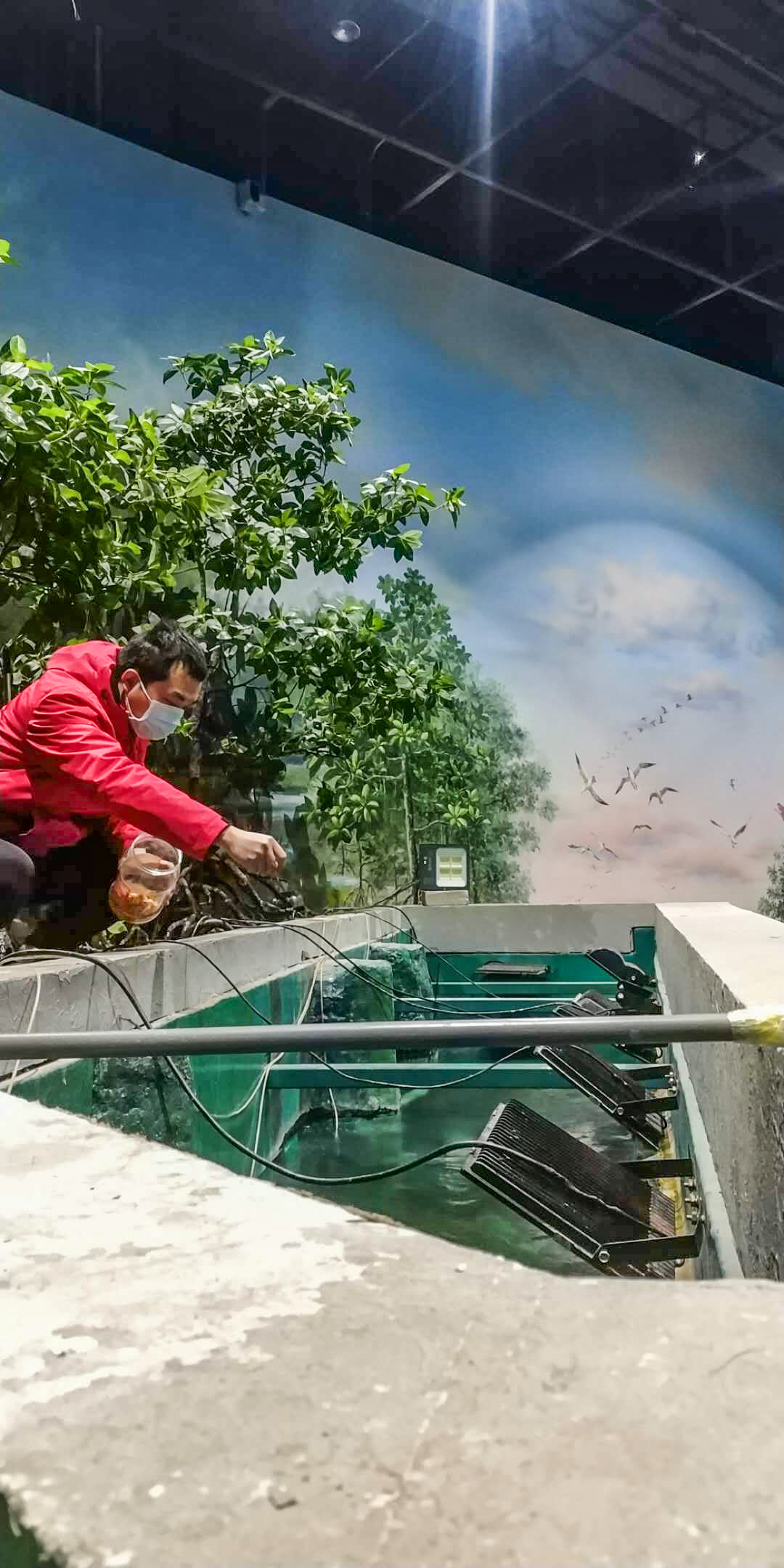 值守的工作人员每日对循环设备和制氧设备进行数次检查,同时在全馆照明关闭的情况下,临时紧急改良了生态鱼缸的照明,设置为白天定时开启,晚间定时关闭,全面确保鱼群水环境健康,并尽可能地减能降耗。