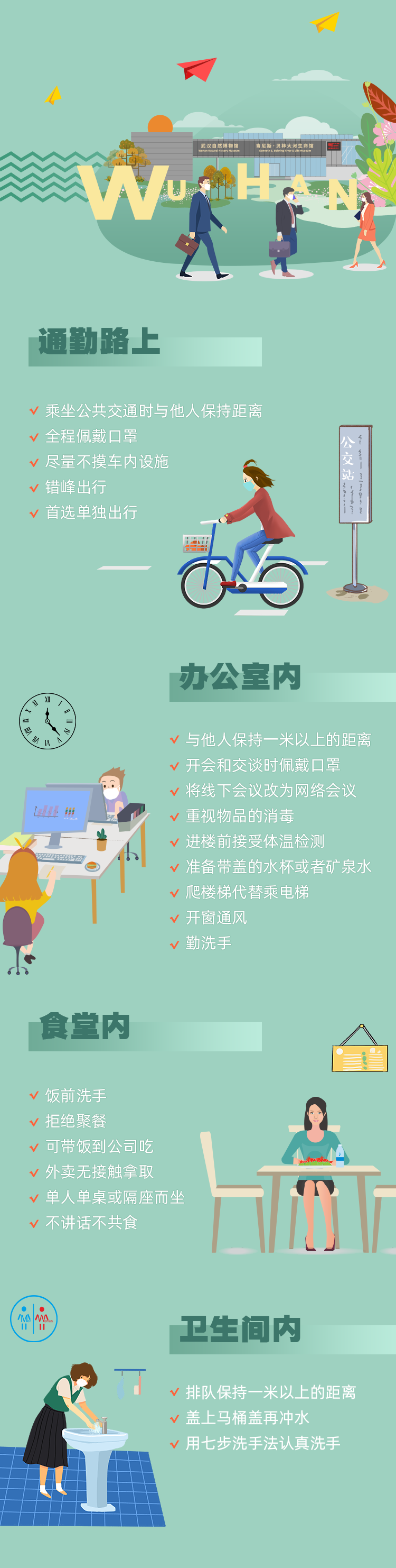 不少人已开启复工模式,通勤路上如何防护?办公室里要注意哪些细节?在食堂用餐应规避哪些风险?收好下面这份复工防疫贴士,关键信息一目了然。